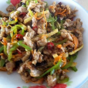 先将肉翻炒一遍,然后加入葱姜蒜翻炒,加入红辣椒,加入其他材料,一起翻炒,最后加入醋,酱油,少许盐,香油,鸡精。出锅!