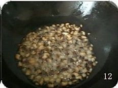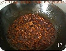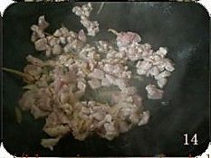 下入肉丁翻炒变色,然后倒入调好的酱汁