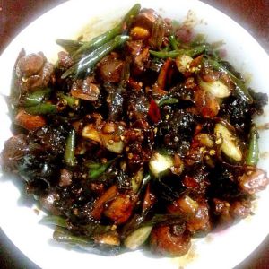 放青椒,木耳,加盐。翻炒一会至青椒熟了。