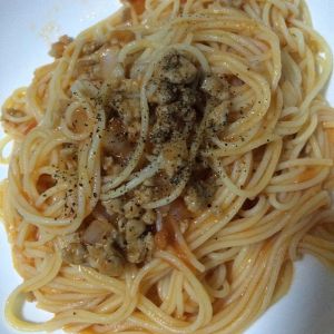 我又少照了一张对不起,这步是把意大利面倒进锅里,拌匀即可出锅啦~
