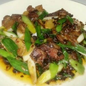 油烧七成热下花椒粒煸香后捞出,将切吃薄片的肉入锅炒至变成淡黄色,炒出了些许油,把肉拨到一边,下入姜蒜片炒出香味,下入豆瓣酱和醪糟翻炒,然后依次下入蒜白蒜蒜叶,放少许盐胡椒粉,只留少量汁即可出锅。