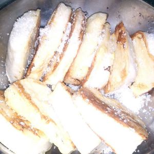 锅预热加入少许油,馍片沾满蛋液,煎至金黄即可,装盘后撒上白糖就大功搞成啦