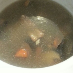 炖锅内加水,放入姜片和排骨,炖约1小时