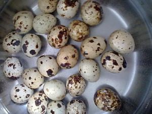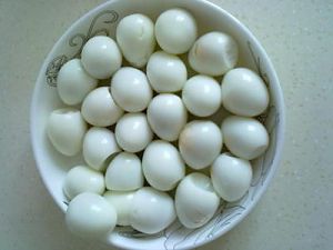 鹌鹑蛋煮熟后过凉水浸凉后,剥去外壳,晾干鹌鹑蛋表面的水分