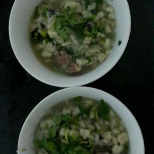 摸软入汤后加盐和味精,放入蒜苗后起锅。