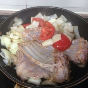 锅中放入橄榄油加热,煎制羊排、西红柿、洋葱。