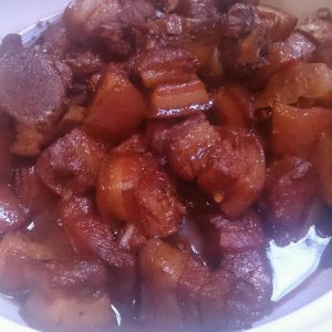 3.放开水没过肉,加南乳汁,酱油,老抽。开锅后调到小锅炖1.5小时。