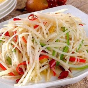 将土豆削皮,切细丝,泡在水中洗去淀粉,既能避免其变黑,又能使其在炒烧时保持白嫩、爽脆。炒前捞出,沥干水分
