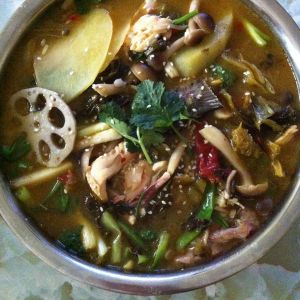 倒适量油,油温八成热放酸菜、姜、蒜、小米椒、花椒炒香,加一匙豆瓣酱,加清水