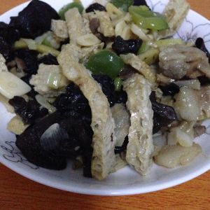 待肉片呈白色后加入柿子椒和青椒片,7—8成熟后加入木耳和脆豆腐