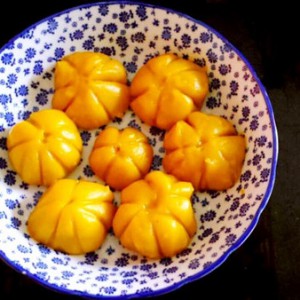 1.把南瓜蒸熟,加入糯米粉搓面团