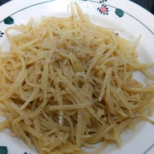 倒入土豆丝翻炒。加入生抽,盐,白醋。盐和醋可以晚一点加。