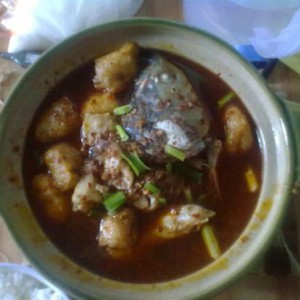 煮沸后,尝一尝咸淡,调味(调料的多少,还有加水量都是不一样的味道的),先把鱼头放进去煮一会儿,然后放入腌制好的鱼片,用筷子把鱼片分开后,就别在乱翻动了,不然鱼肉全散了,沸腾一会,放入油豆腐,确定鱼肉一熟,关火,别煮太久,不然老了,把鱼肉装进放好配菜备用的碗里,撒上葱花