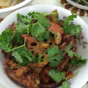 最后依次将慢熟的菜先放,最后放熟的快的菜,炒至所有菜上伴有底料,盛盘
