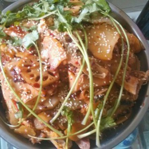放入难熟的,鸡肉莲藕,土豆片。同时倒入麻辣香锅底料。我用的是海底捞的。