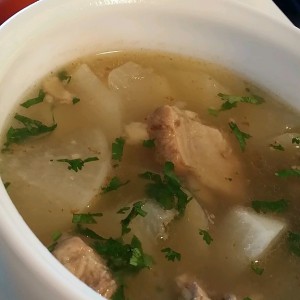 出锅前五分钟加入一个浓汤宝,猪骨口味的。加入少量香油,香菜就做好了,美味又简单哦!也可以用电饭锅炖,调到粥汤档,步骤一样,四十分钟后享受美味吧!