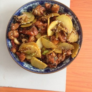 油锅留些油烧热放入葱姜蒜花椒辣椒翻炒出香味,放土豆翻炒熟,然后在倒入鸡块放糖白芝麻,翻炒即可出锅。