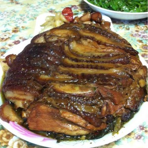 2;在放入油锅里炸至金黄色,捞出。(在炸之前给五花肉涂抹点酱油)放凉,切片,摆入盘中