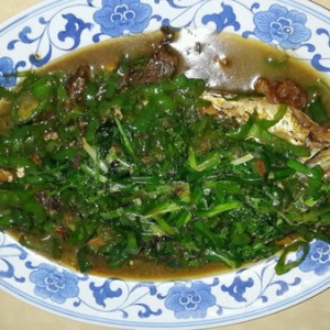 4、待鱼入味后起锅,按个人口味添加青椒、葱、香菜在鱼汤里烧一会,浇到鱼上就完成了!