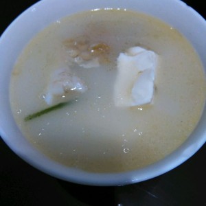 放入豆腐,葱段,鸡精,料酒,小火慢炖