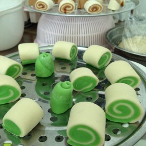 发酵到2倍大小左右,取出,开始反复的揉面历程,如果有力气,就尽量揉吧 用刀切开面团,切断面看不到明显蜂窝状了就好了,。 將兩個顏色的面团重叠,捲起,要棬紧一點哦,再醒15分鐘,溫水上鍋,蒸15分鐘,等5分鐘才開蓋。這樣蒸出來才會好看。