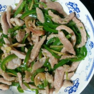 热锅下油,适量即可,放入肥肉小火鞭炒一会,再放入瘦肉,基本变色后即可先盛出来。下姜丝爆香后倒入青椒丝稍微翻炒,再将鞭炒过的肉丝倒入。调味,加入适量盐和鸡精,再炒一会就可以美美的出锅啦~