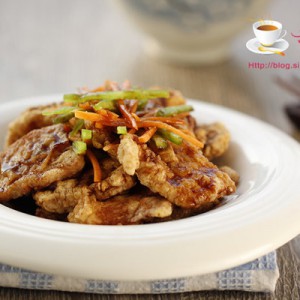 炸好的肉片放入盘中,表面再码放一些青椒丝和红萝卜丝;