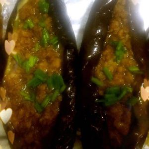 取出烤好的茄子,填入肉末蒜蓉酱,继续烤5分钟。