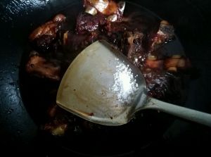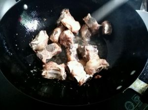放入排骨,一直炒到排骨变色后,表面微焦。