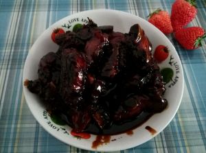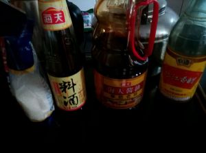 先放一勺料酒,然后放两勺生抽,三勺白糖,四勺米醋炒匀。