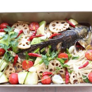 烤盘底部抹油,放葱姜蒜适量,放入腌好的鱼,烤箱预热200度30分钟。