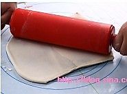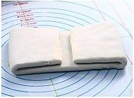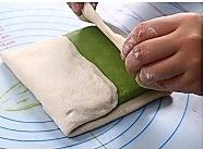将油皮擀成厚1厘米的方块状,水皮擀成厚度为0.6cm的长片状,比油皮长一倍的大小。
