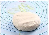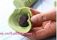 将面卷切成每个面团2cm后的小剂子,压扁后擀成片状,包入10克的红豆沙,捏紧收口,收口朝下排入烤盘。