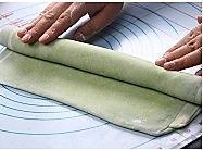 将面皮擀长,然后像叠被子一样两边往中间对折,再对折,松弛5分钟,再重复叠一次。