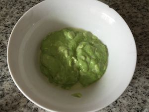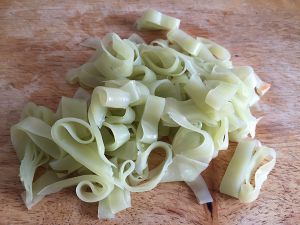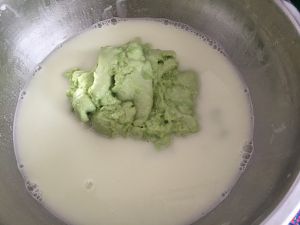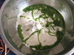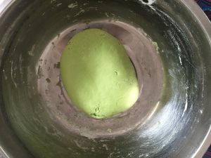 面粉中盐混和均匀,放入菠菜汁,和成稍硬的面团。