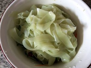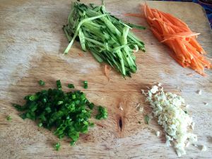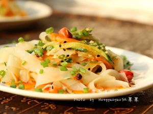 胡萝卜、黄瓜切丝。葱、蒜切末。胡萝卜放到开水中焯熟。