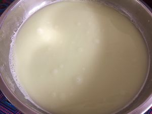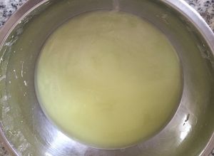 面水静置一夜,第二天,淀粉都沉到了下面,将上面的清水过筛倒掉。混和均匀。