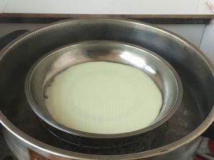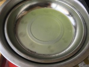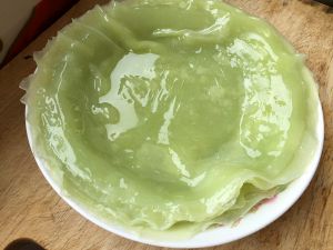 取一个盘子,涂上薄薄的一层食用油,舀一勺面糊倒在盘子里,放到锅中蒸熟。