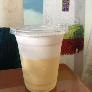 把以上混合物过筛倒入杯子,擦干净杯壁后,放入冰箱等他凝固咯~第一杯准备下面一层是芒果牛奶糊,上面一层准备做酸奶糊~