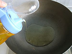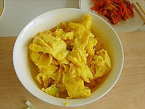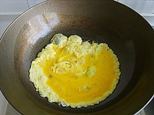 倒入搅拌均匀的鸡蛋,注意,放鸡蛋之前要用葱花爆锅。