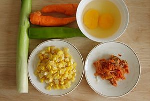 胡萝卜、甜玉米、泡菜少许、俩鸡蛋、尖椒、大葱。
