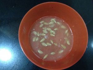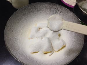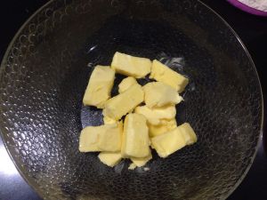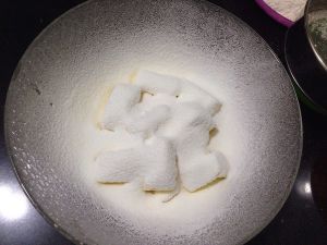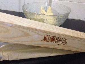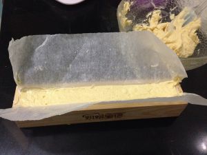 像这样直接倒扣在冰箱冷冻室里,冷冻90小时分钟以上,至冻硬定型。因为面糊很稀,用油纸包着放人冰箱时会变形,所以直接倒扣在冰箱里最简单。