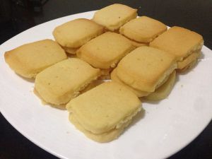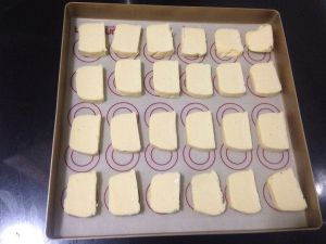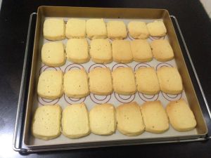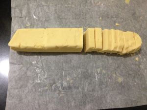 将冻硬的面团切成0.7cm的厚片(不能切太薄,烤好后会塌下变薄。)