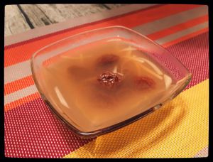 将汁煮到这样的颜色,放入姜丝及白醋,再煮5分钟。同时将苦瓜放入干净的涨水里过20秒。