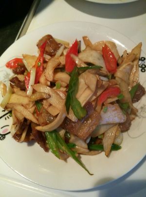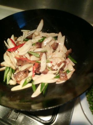 七成熟时放入盐少许,生抽少许,加入青红椒翻炒
