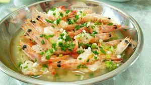 把腌制好的虾背朝上排在蒸盘里,浇上热油呛香的蒜泥,放蒸锅里蒸8分钟后起锅,撒葱花浇热油即可上桌。