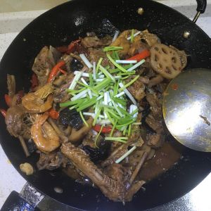 将炒黄的排骨与鸭翅、大虾放入翻炒