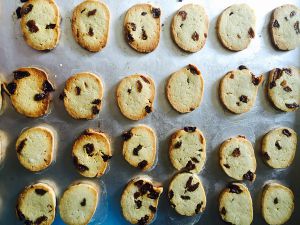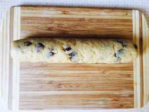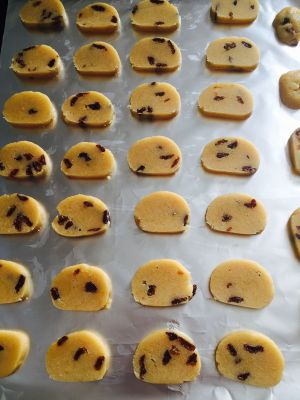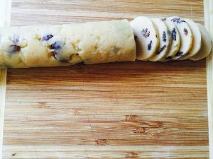 烤箱预热180度,取出冷冻好的面团用刀切片,自己吃的就切成椭圆形也不错