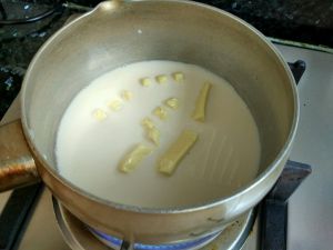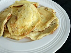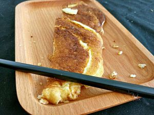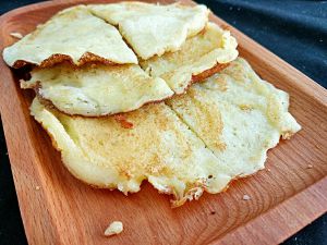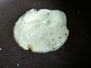 不粘锅,用勺子(一般装汤的大勺)倒入半勺尽量弄薄弄圆,中小火到表面起很多小洞,小心的翻面然后轻压一下铲起。