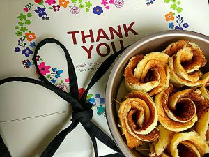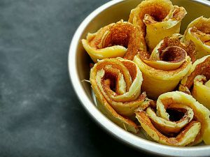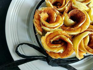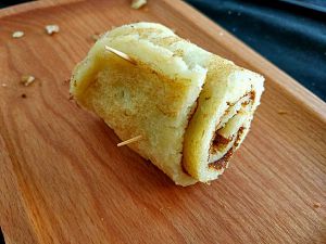 翻过面来,用筷子作为中心卷起(记得,要一层叠一层,最底下的作为中心先卷)